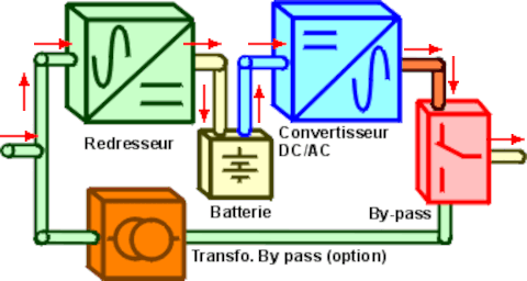 Ce type d'onduleur régule la tension en continue car les batteries sont montées en série entre un chargeur/redresseur et l'onduleur ; il n'y a donc pas de commutation.